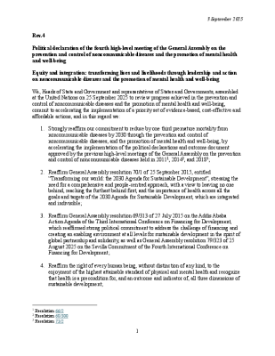 Politische Erklärung der vierten hochrangigen Tagung der Generalversammlung der Vereinten Nationen zur Prävention und Bekämpfung nichtübertragbarer Krankheiten und zur Förderung der psychischen Gesundheit und des Wohlbefindens.