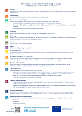 Der Europäische Kodex zur Krebsbekämpfung in seiner fünften Auflage (ECAC5) besteht aus 14 Empfehlungen, die auf wissenschaftlichen Erkenntnissen beruhen und sich auf persönliche Verhaltensfaktoren, Umweltfaktoren und medizinische Behandlungen beziehen, die die breite Bevölkerung in der EU betreffen. Zum ersten Mal richtet sich der ECAC5 nicht nur an Einzelpersonen, sondern auch an politische Entscheidungstragende. Für sie enthält er 14 ergänzende Handlungsempfehlungen (in englischer Sprache) zu Maßnahmen auf Bevölkerungsebene, welche die Empfehlungen für Einzelpersonen verstärken können. Diese Empfehlungen bieten auch positive Nebeneffekte zur Prävention anderer nichtübertragbarer Krankheiten mit ähnlichen Risikofaktoren sowie Möglichkeiten der Gesundheitsförderung. Zusammen bieten die ECAC5-Empfehlungen einen Fahrplan zur Verringerung des Krebsrisikos, zur Bekämpfung falscher Vorstellungen von Krebs und zur Verbesserung der öffentlichen Gesundheit und des Wohlbefindens der Menschen.