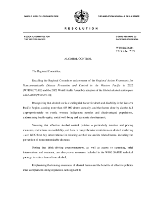 Diese Resolution zur Alkoholkontrolle wurde von allen 38 Mitgliedstaaten und Gebieten der Region Westpazifik auf der 76. Tagung des WHO-Regionalkomitees (RCM76) vom 20. bis 24. Oktober in Fidschi einstimmig verabschiedet.